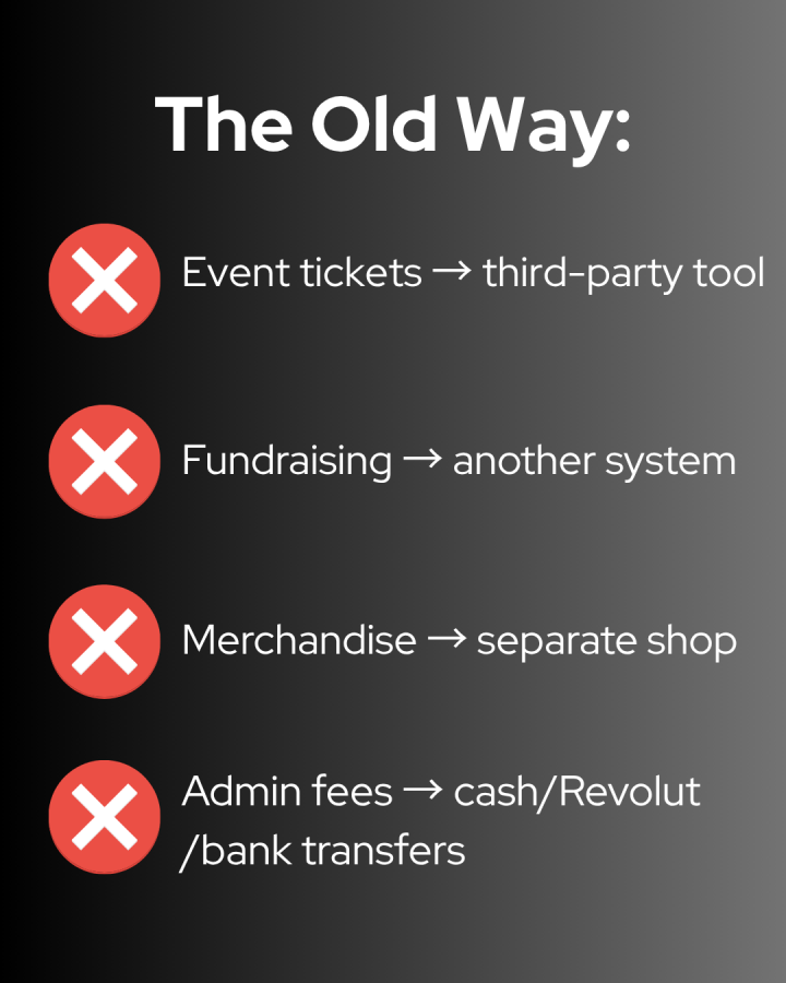 Replace cash, Revolut, and manual tracking with a single system that keeps all club payments organised and easy to manage.