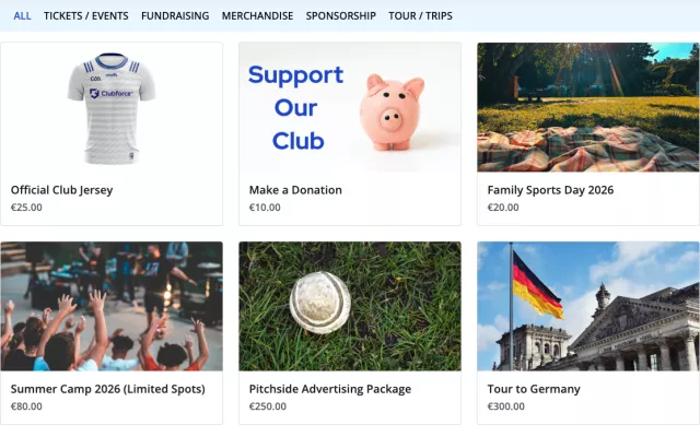 Create an online shop for your club and allow members and supporters to purchase anytime.